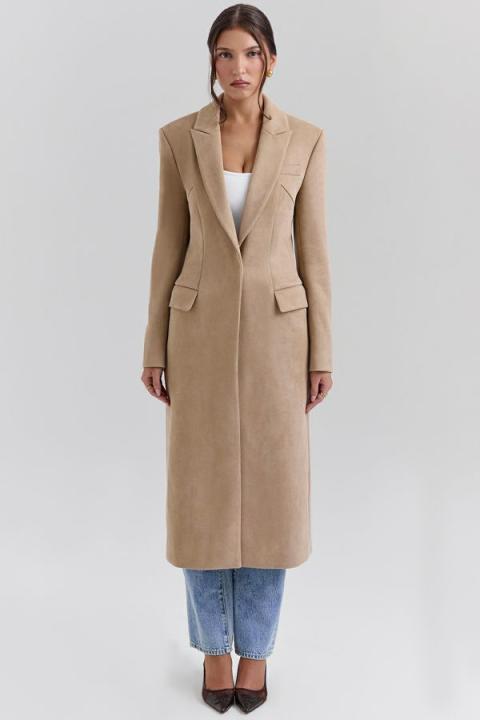 Our sleek and stylish ‘Remi’ coat is impeccably tailored from a soft heavyweight felted twill and is a masterclass in sleek styling to elevate your outerwear game. The longline peak lapels and sharply tailored waist create a flattering silhouette, while the single-breasted cut with an invisible button offers a streamlined finish. Flap pockets add both function and flair, making it as practical as it is polished. Inside, a silky lining ensures comfort, making every wear feel luxurious. Whether you’re heading to the office or out for a night on the town, the Remi’ is your ultimate statement piece. Style it over a fitted turtleneck and high-waisted trousers for a chic monochrome look, or drape it over a cosy knit and tailored jeans for a relaxed weekend vibe. WHERE TO WEAR : Stylish lunch dates, nights out in the city, weekend breaks, brunch with the girls. TEAM YOURS WITH : Jeans, boots and casual knits. SPECIFICATIONS : Main – Felted TwillLining – Stretch Satin Stretch Factor: Little Stretch Designed For House Of CBShop more Outerwear here Length: Approx 122cmGentle Dry Clean Only Studio image model is 5’7 and lookbook model is 5’8. Both wear XS. Colour may vary due to lighting on images. The product images (without model) are closest to the true colour of the product. Item runs true to size chart and is cut to suit our size chart. Please refer to our size chart for the best fit. Do not size up or down.