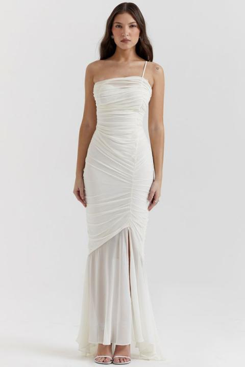 Our ‘Pearla’ dress is like a modern day fairytale, gorgeously designed in a lightweight georgette that’s beautifully ruched over your curves and sweeps the floor with graceful movement. The bodice is boned to cinch your waist and is supported with underwired cups. The delicate satin strap adjusts for the perfect fit.Hugging your curves ‘Pearla’ is a dream in ivory and your elegant choice for those extra special events. It zips to the back for easy on. Wear yours with neutral sandals like ‘Marivel’ . The ‘Regular Cup’ option suits cup size A-C whilst the ‘Bigger Cup’ option suits cup size D-E.WHERE TO WEAR : Romantic date nights, stylish dinner parties, champagne with the girls, weddings, glam functions and events.TEAM YOURS WITH : ‘Marivel’ sandals in neutral and an embellished clutch.UNDERWEAR SOLUTION : No bra required as it’s cupped and lined.Made from georgette. Fully lined. Stretch Factor: Some Stretch Designed For House Of CBShop more Maxi Dresses hereDress Length: Approx 169cm Gentle Dry Clean Only Model is 5 ft 8 and wears size XS Colour may vary due to lighting on images. The product images (without model) are closest to the true colour of the product. Item runs true to size chart and is cut to suit our size chart. Please refer to our size chart for the best fit. Do not size up or down.