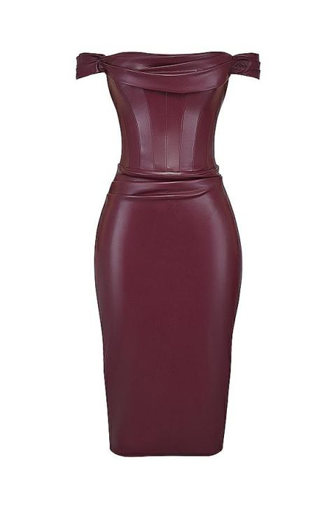 Our ‘Raven’ midi dress has strategically placed seams through the bodice that features internal boning and a pleated neckline. The buttery vegan leather is just as supple as the real thing as it hugs your figure to create the most gorgeous silhouette. We especially love how the pretty straps can be worn on or off the shoulders depending on your vibe. It zips to the back for easy on and the mulberry hue will look equally as chic with black heels like ‘Paris’ .WHERE TO WEAR : Romantic date nights, stylish dinner dates, champagne with the girls, rooftop bars, glam functions and events.TEAM YOURS WITH : ‘Paris’ heels in black and a tonal clutch.UNDERWEAR SOLUTION : We suggest our ‘Smooth’ strapless bra if required.Made from buttery vegan leather. Fully lined. Stretch Factor: Little Stretch Designed For House Of CBShop more Midi Dresses hereDress Length: Approx 105cm Gentle Dry Clean Only Model is 5 ft 8 and wears size XS Colour may vary due to lighting on images. The product images (without model) are closest to the true colour of the product. Item runs true to size chart and is cut to suit our size chart. Please refer to our size chart for the best fit. Do not size up or down.