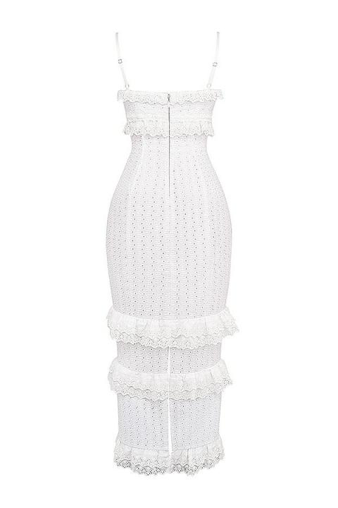 Cut from dainty broderie anglaise, ‘Eve’ is inspired by the warmth of Spring and endless Summer days with plenty of pretty drama. The romantic sweetheart neckline has underwired cups and the bodice is fitted with internal side boning to flatter and cinch your shape with slim adjustable straps.It has a close and flattering fit and the softly gathered ruffles make ‘Eve’ so pretty as they beautifully flutter in the breeze. It zips up the back, has a split to the hem for easy movement and is fully lined for comfort. Wear yours with delicate heels like ‘Lola’ in white . The ‘Regular Cup’ option suits cup size A-C whilst the ‘Bigger Cup’ option suits cup size D-E.WHERE TO WEAR : Pretty date nights, alfresco dinner dates, champagne with the girls, bottomless brunches, garden parties, vacays.TEAM YOURS WITH : ‘Lola’ high heels in white and a mini bucket bag.UNDERWEAR SOLUTION : No bra required as it’s cupped and lined.Made from dainty broderie anglaise. Fully lined. Stretch Factor: Little Stretch Designed For House Of CBShop more Maxi Dresses hereDress Length: Approx 147cm Materials: New Dainty Embroidery Anglais, Broderie Lace Trim, Light Rayon Gentle Dry Clean Only Model is 5 ft 8 and wears size XS Colour may vary due to lighting on images. The product images (without model) are closest to the true colour of the product. Item runs true to size chart and is cut to suit our size chart. Please refer to our size chart for the best fit. Do not size up or down.